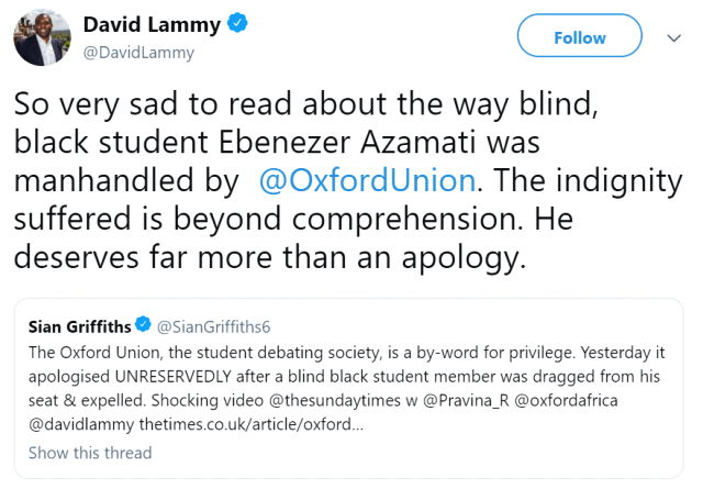 The resignation of the union president over the Ebenezer Azamati case is simply not enough. Those security men need to be sacked immediately. Gone completely. What’s more is the Oxford Union president should be replaced with someone who is both disabled and black. Stop having ableist societies with narrowly conceived views of who people are and what they can or should do and what their looks should constitute.