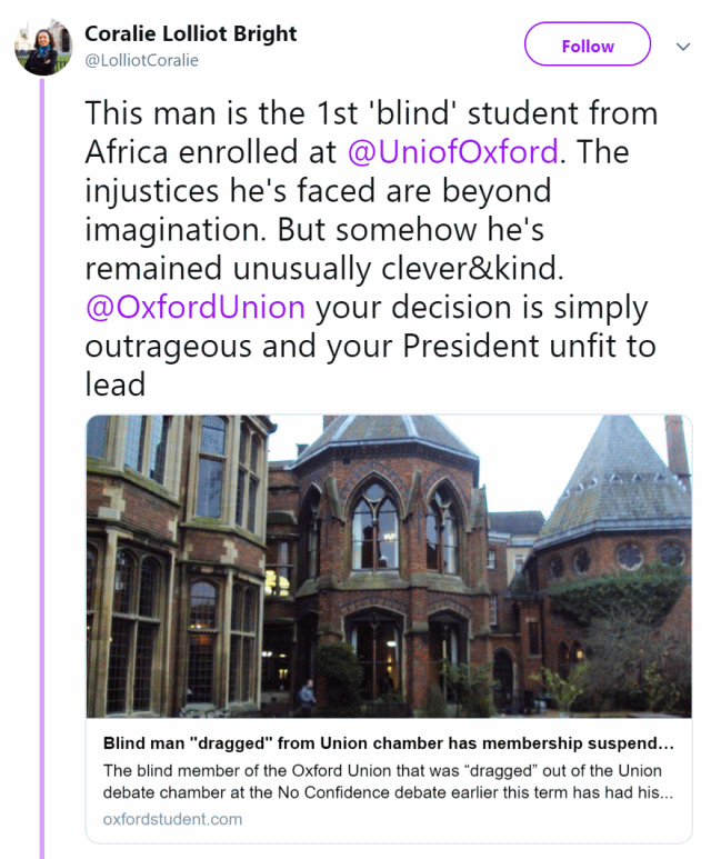 It makes me very angry that people can do this. What Ebenezer Azamati needs to do is sue the Oxford Union for abject discrimination, both disability and racist. These people must not be allowed to get away with it.