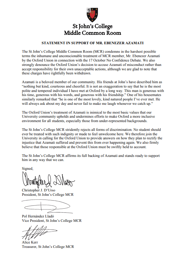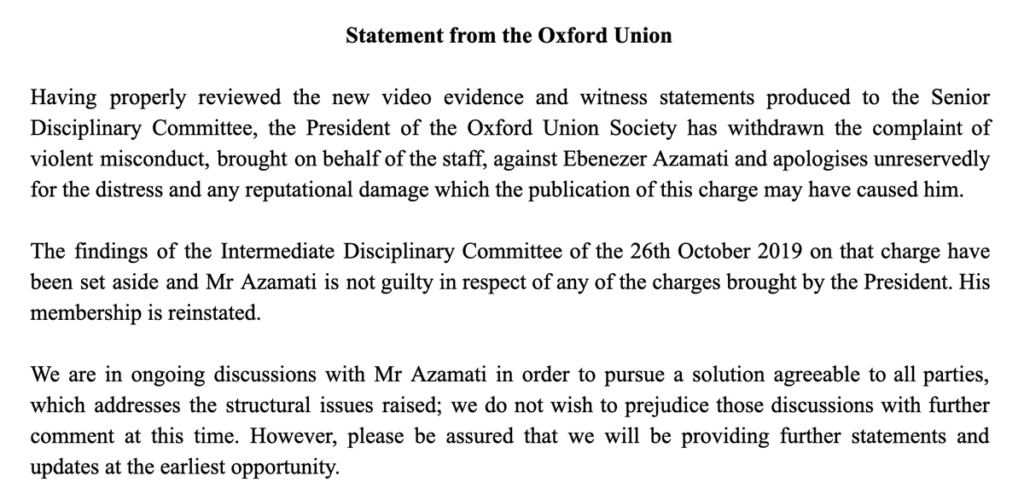The Oxford University Africa Society (AfriSoc) strongly condemns the violent, unjust, inhumane, and shameful treatment of our member, Mr. Ebenezer Azamati, a Ghanaian MPhil student in International Relations at St. John’s College, at the Union Chambers by a Union staff on the evening of 17 October, 2019. No individual deserves to be treated in that manner. Source: Oxford University Africa Society