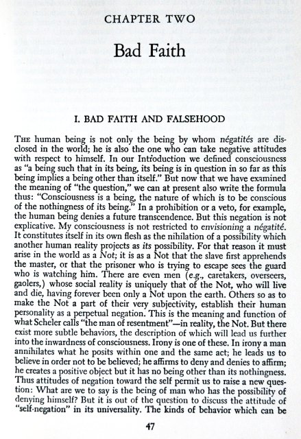 Perhaps the most notable, most well known aspect of Sartre’s book is Bad Faith. Though the concept has been around a long time, Sartre took it to new levels.