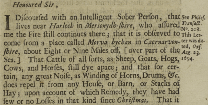 ‘it is observed to come from a place called Morva Bychan in Caernarvonshire, about Eight or Nine Miles off [over part of the Sea.] That Cattle of all sorts, as Sheep, Goats, Hogs, Cows, and Horses, still dye apace; and that for certain, any great Noise, as Winding of Horns, Drums, &c. does repel it from any House, or Barn, or Stacks of Hay…